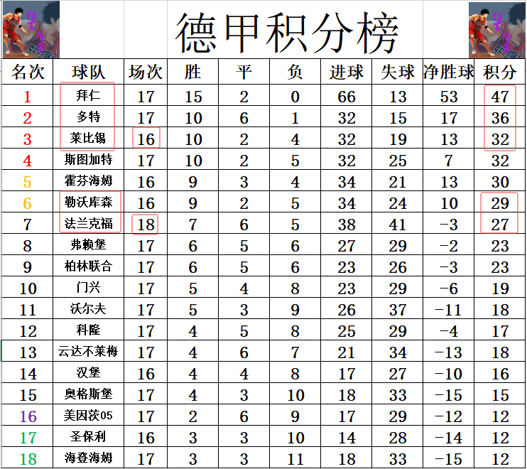 积分榜方面,拜仁上半程以11分的巨大优势轻松拿到半程冠军,本轮他们将在客场对阵下半程第一个对手莱比锡,本赛季首轮拜仁就是在主场6:0狂胜莱比锡开了个好头,现在莱比锡和多特是潜在的稍微有些可能追赶拜仁的球队,因此本轮客场再战莱比锡,将是拜仁下半程的关键一战。法兰克福今天本有机会追上勒沃库森,只是两度领先没有把握机会,最后绝平,差勒沃库森2分还是排在第7。