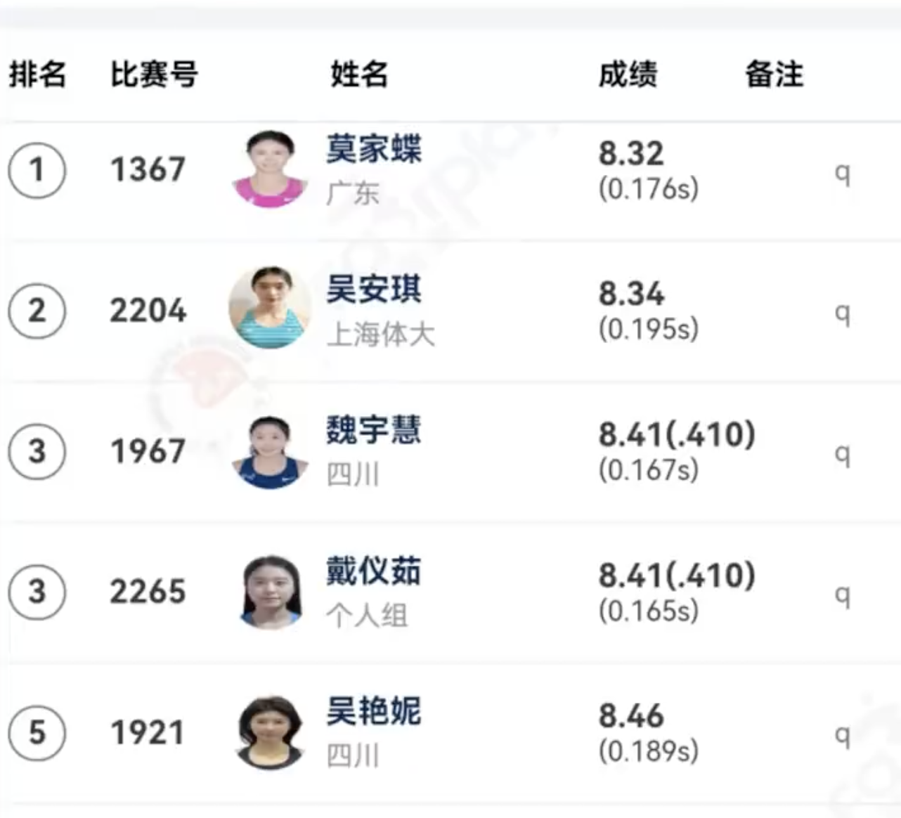 不过,吴艳妮随后依靠出色的爆发力以及跨栏技术,强势反超了所有对手,拿下小组第一的成绩。吴艳妮的成绩最终为8秒47。在所有选手中,吴艳妮排名第5,顺利进入决赛。